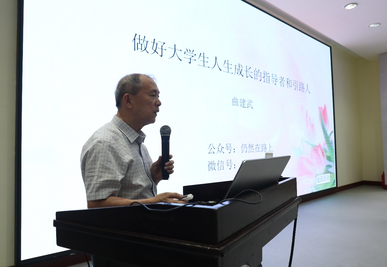两个多小时的报告,曲建武教授全程站立、滴水未沾。他以“做好大学生人生成长的指导者和引路人”为题,从“不忘初心使命”和“倾力铸魂育人”两方面,结合学校实际从思政工作者和学生两个角度,深入探讨了如何传承大学文化,增强政治文化之心;怎样加强学习,向榜样看齐,坚定理想信念,脚踏实地工作等多项内容。他结合自己四十余载的心路历程、工作经历,阐述了如何做一名思想有深度、人格有高度、胸怀有广度、情感有温度的辅导员,整场报告充满了教育的温度和力量,让全场师生深受感动和启发。