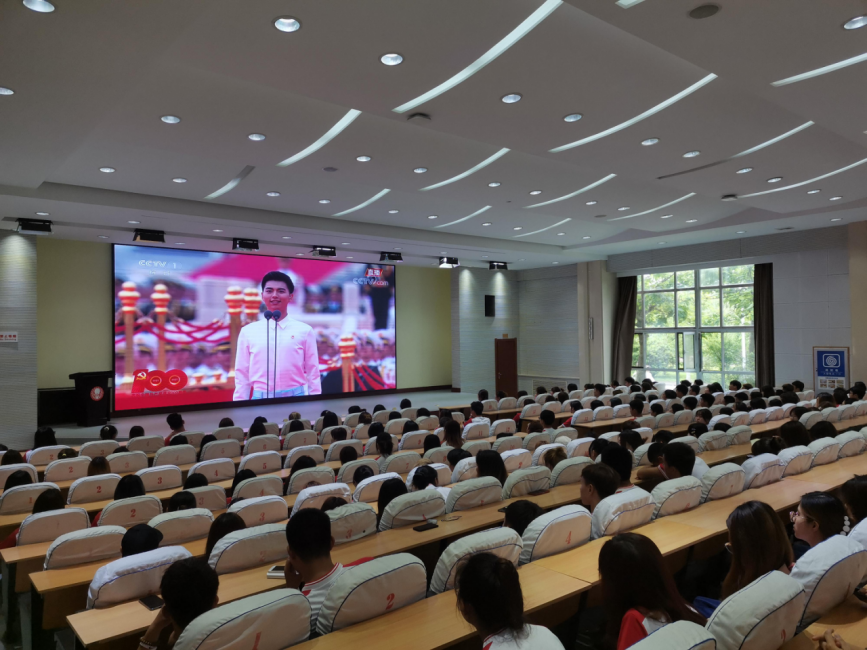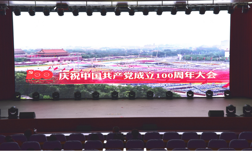 七一当天,学校设立了两个主会场集中收看庆祝中国共产党成立100周年大会的现场直播:在A报告厅的主会场,全校中层以上领导干部、全体教工党员共计300多人进行了集中收看;在B报告厅主会场,学生入党积极分子300多人进行了集中收看;对非党教师和当天有课的教师,学校党委组织他们自行收看。
