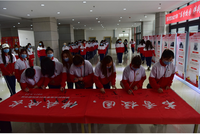 参加启动仪式的同学们在“书香校园,伴我成长”主题条幅上签上了自己的名字,做文明校园的倡导者,见证图书馆发展历程。